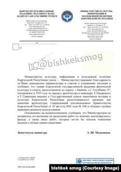 Ишенимдүү булактар билдиргендей, Маданият министрлиги имараттын сыртын оңдоп-түзөөнү жана өзгөртүүнү токтотууну талап кылып, академияга кат жолдогон.